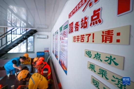 7月7日,在山東省榮成市觀海路東段一處戶外勞動者“愛心驛站”,志愿者為環(huán)衛(wèi)工人、外賣配送員等戶外工作者沏茶、加水。