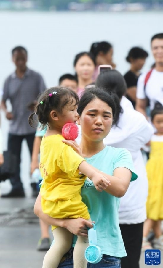 7月10日,在杭州西湖景區(qū),一位母親手持兩個風(fēng)扇和女兒游玩。