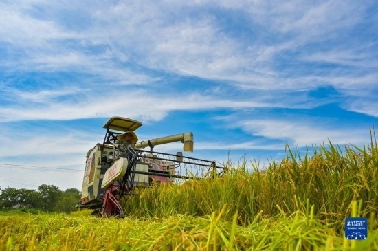 7月11日,在湖南省婁底市雙峰縣井字鎮(zhèn)白碧村,農民駕駛農機收割早稻。