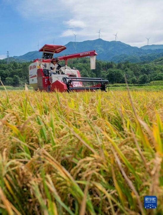 7月10日,在湖南省永州市道縣四馬橋鎮(zhèn)金獅庵村,農民駕駛農機在田間收割早稻。