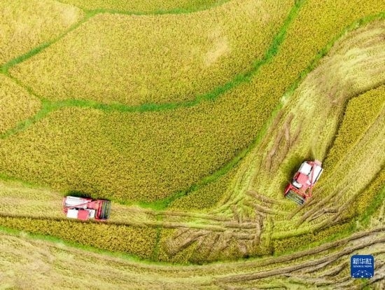 7月10日,在湖南省永州市道縣四馬橋鎮(zhèn)金獅庵村,農民駕駛農機在田間收割早稻(無人機照片)。
