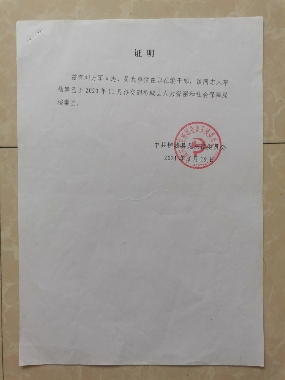 柳城縣太平鎮(zhèn)和龍頭鎮(zhèn)都曾出具《證明》,指出劉萬軍屬“在職在編人員”。圖/劉萬軍提供