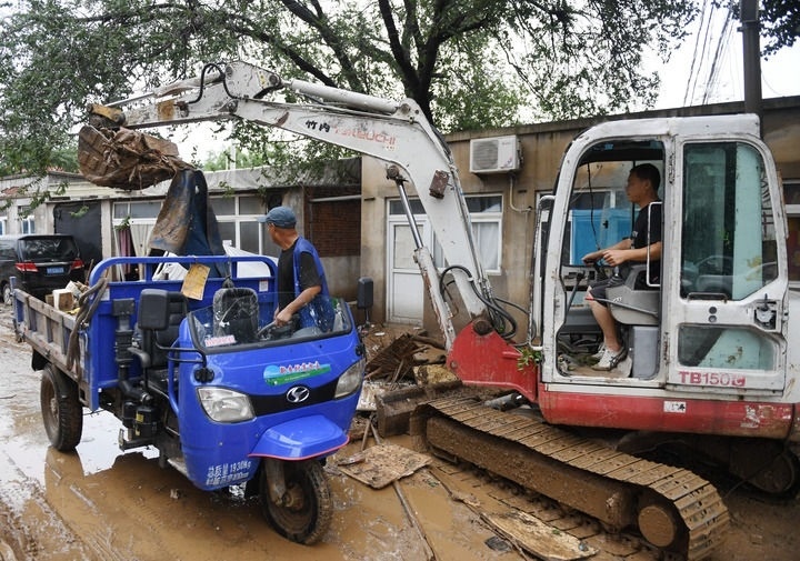 8月1日,在北京市房山區(qū)青龍湖鎮(zhèn)上萬村,工作人員清理山洪過后受災(zāi)道路。新華社記者 張晨霖 攝