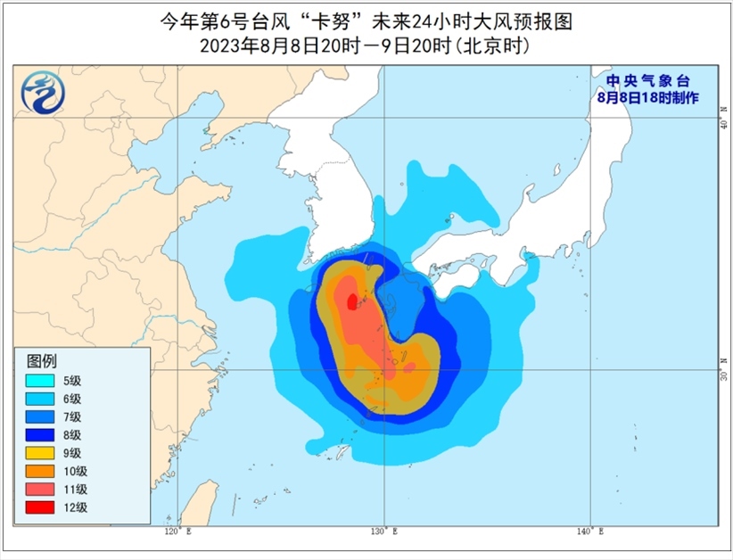 受“卡努”影響,8月8日至9日,巴士海峽、臺(tái)灣海峽北部、臺(tái)灣以東洋面、東海南部和東部及釣魚(yú)島附近海域有6級(jí)至7級(jí)大風(fēng),東海東部部分海域風(fēng)力可達(dá)8級(jí)至10級(jí),“卡努”中心經(jīng)過(guò)的附近海域風(fēng)力可達(dá)11級(jí)至12級(jí),陣風(fēng)13級(jí)至14級(jí)。