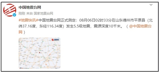 ·山東德州市平原縣發(fā)生5.5級地震,震源深度10公里,河南、河北等地震感強(qiáng)烈。已發(fā)生余震52次,有10人受傷,濟(jì)南啟動(dòng)三級應(yīng)急響應(yīng)。