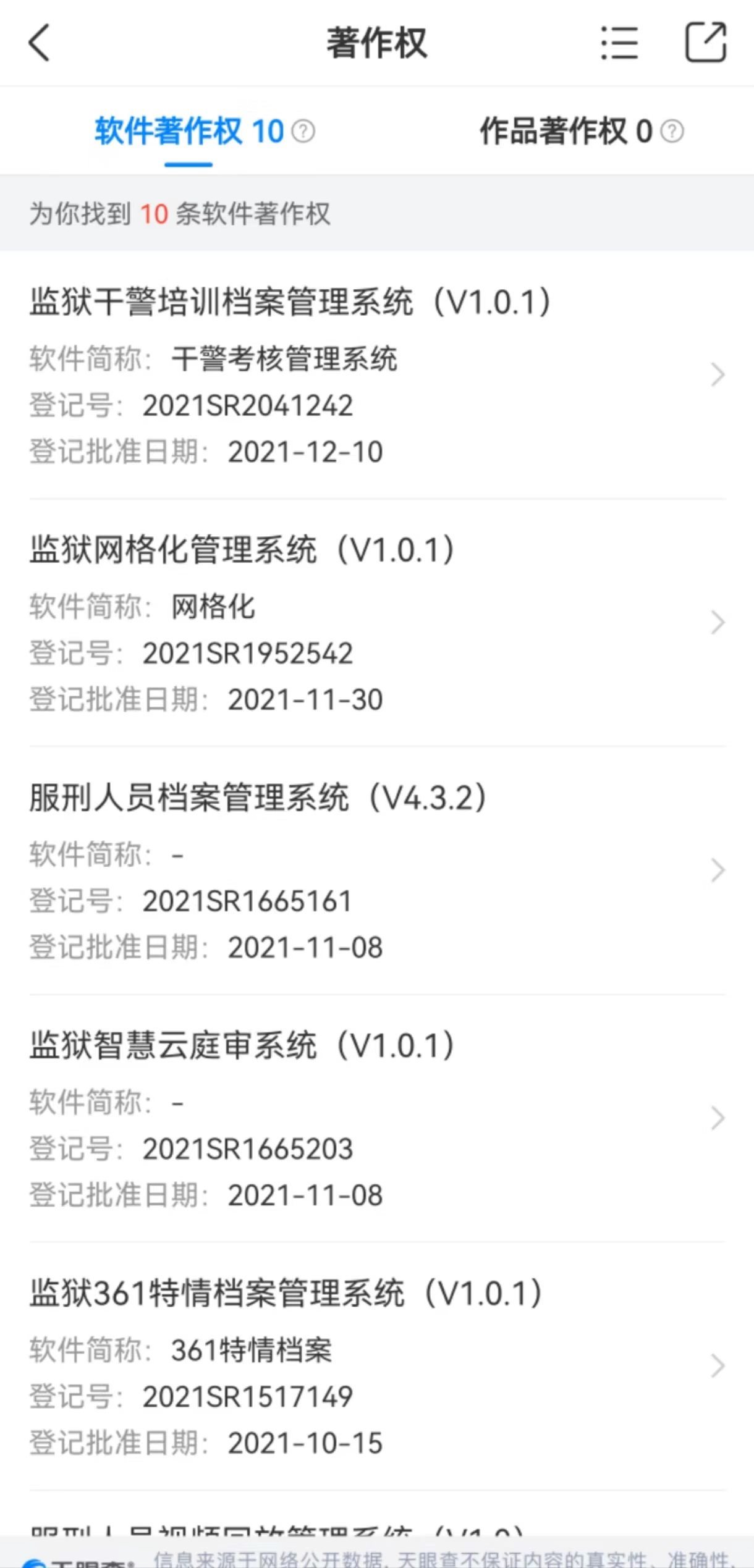 如上述立馳信息在官網(wǎng)中的自我介紹,澎湃新聞通過天眼查App檢索發(fā)現(xiàn),2021年一整年,立馳信息就獲批登記了包括上述“親情會(huì)見1.0”在內(nèi)的多個(gè)涉監(jiān)獄管理的系統(tǒng)。如監(jiān)獄固定資產(chǎn)管理系統(tǒng)、點(diǎn)名管理系統(tǒng)、服刑人員會(huì)見管理系統(tǒng)、監(jiān)獄干警培訓(xùn)檔案管理系統(tǒng)等共計(jì)10項(xiàng)。