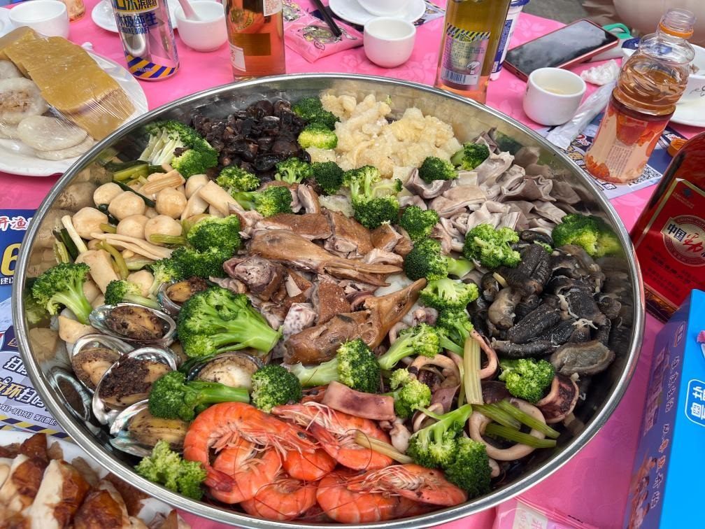 開(kāi)漁宴上鋪滿海鮮的漁家大盤菜。(陽(yáng)江廣播電視臺(tái)供圖)