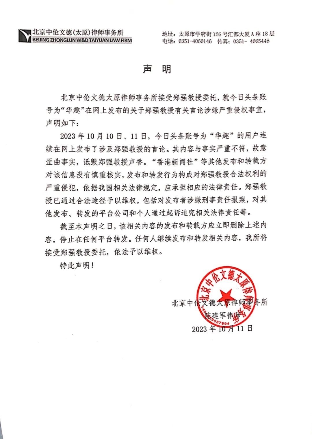 同時,北京中倫文德太原律師事務(wù)所接受鄭強(qiáng)教授委托發(fā)表聲明,將依法予以維權(quán)。