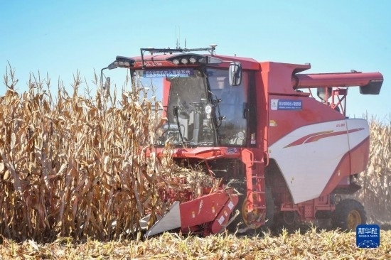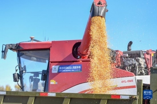 10月19日,在中國科學(xué)院“黑土糧倉”科技會戰(zhàn)長春示范區(qū)公主嶺示范基地,無人駕駛農(nóng)機在收獲玉米。