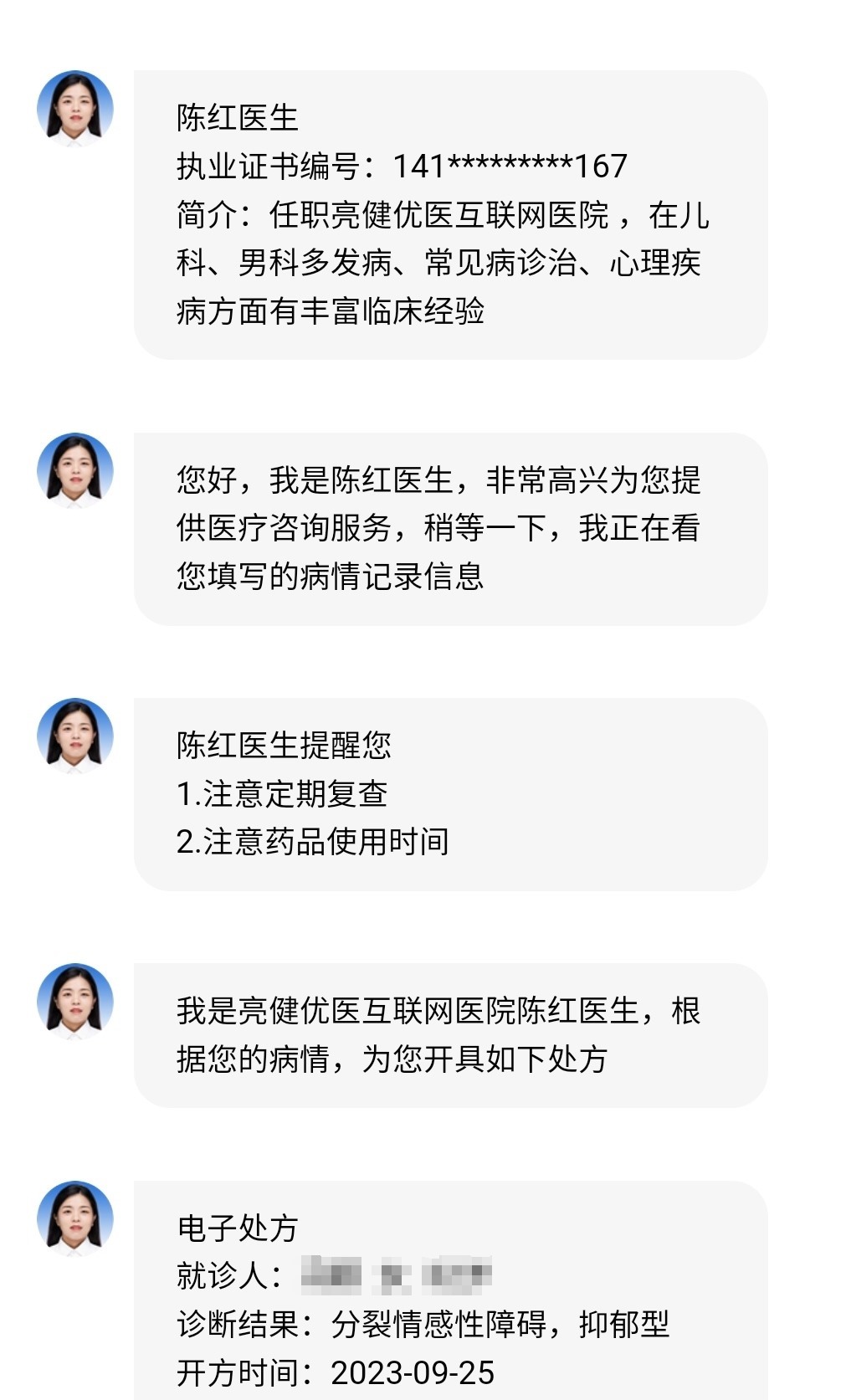 不僅是問診環(huán)節(jié)存在問題,開處方環(huán)節(jié)也有漏洞。記者發(fā)現(xiàn),一家名為“亮健好藥網(wǎng)”的企業(yè),在銷售抗抑郁類藥物“米氮平”“百憂解”等藥物時,其他平臺都需要上傳處方照片進行審核,而記者多次上傳不同樣式的風景照,每次都會跳出來一位“亮健優(yōu)醫(yī)互聯(lián)網(wǎng)醫(yī)院陳紅醫(yī)生”接診,根據(jù)介紹,她在兒科、男科多發(fā)病、常見病診治、心理疾病方面有豐富臨床經(jīng)驗。根據(jù)記者上傳的風景照,陳醫(yī)生瞬間開具了電子處方,并進入了藥師審核階段。隨后記者取消訂單,并在不同時間,多次嘗試上傳風景照,發(fā)現(xiàn)每次都是這位陳紅醫(yī)生瞬間開方。雖然后續(xù)亮健平臺藥師都會致電記者要求補充處方才能開藥,但這位陳紅醫(yī)生卻總能第一時間看著風景照“秒開處方”。