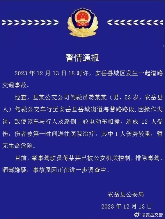 ·四川安岳一公交車中學(xué)門口撞倒多名學(xué)生,警方通報:12人受傷。