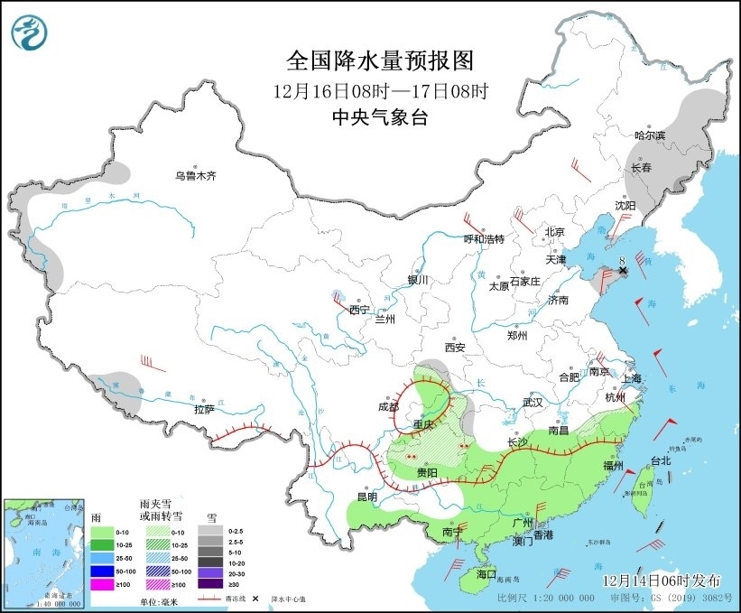 圖6 全國降水量預報圖(12月15日08時-16日08時)