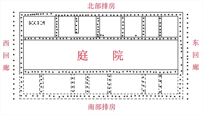 “從柱洞的分布規(guī)律來看,這一夯土臺(tái)基整體應(yīng)是南北為排房建筑、中部為庭院、東西帶回廊的結(jié)構(gòu),規(guī)模宏大,結(jié)構(gòu)復(fù)雜?!惫懦钦z址發(fā)掘現(xiàn)場(chǎng)負(fù)責(zé)人李博說。