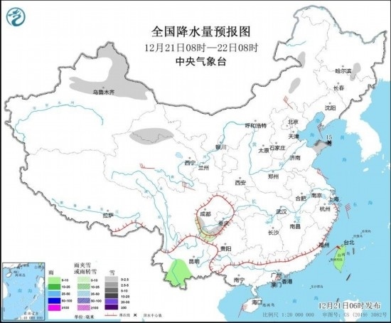12月21日08時至22日08時,新疆北部、甘肅河西、黃淮東部等地部分地區(qū)有小雪或雨夾雪,其中,山東半島等地部分地區(qū)有中到大雪,局地暴雪(10~15毫米)。云南西南部和中部、臺灣島等地部分地區(qū)有小雨。內(nèi)蒙古東南部、青海北部、江蘇中部、川西高原北部等地部分地區(qū)有4~6級風(見圖3)。