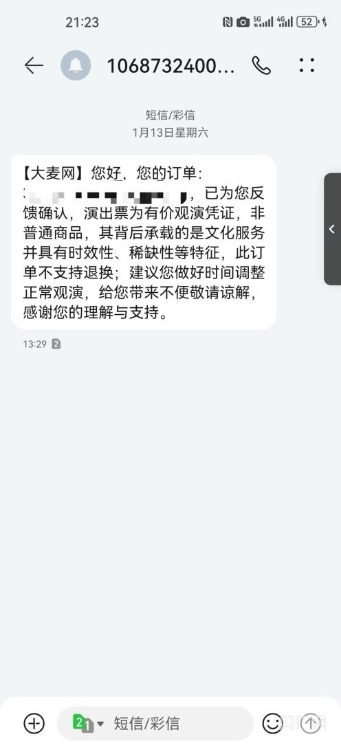 周女士說(shuō)自己第一時(shí)間就通過(guò)多個(gè)渠道嘗試退票,但都沒(méi)有成功?!叭斯た头墓ぷ鲿r(shí)間是早上9點(diǎn)到晚上8點(diǎn),我打電話的時(shí)候不在他們工作時(shí)間范圍內(nèi)。當(dāng)時(shí)也確實(shí)聯(lián)系不到其他渠道,于是我就在12315,包括黑貓投訴進(jìn)行退票退款的申請(qǐng)。13號(hào)早上9點(diǎn),大麥客服說(shuō)此訂單不支持退換,13號(hào)下午1點(diǎn)半的時(shí)候,給了我一個(gè)反饋短信,說(shuō)是已為我反饋確認(rèn),演出票為有價(jià)觀影憑證非普通商品,其背后承載的是文化服務(wù),并具有時(shí)效性、稀缺性等特征,此訂單不支持退換,然后就建議我做好時(shí)間調(diào)整正常觀演。”