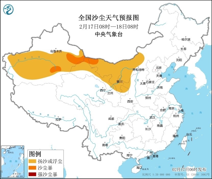 受冷空氣大風(fēng)影響,預(yù)計2月17日08時至18日08時,新疆東部和南疆盆地、內(nèi)蒙古中西部、甘肅北部、寧夏大部、陜西西北部等地的部分地區(qū)有揚(yáng)沙或浮塵天氣,新疆東部和南疆盆地東南部、內(nèi)蒙古西部、甘肅北部等局地有沙塵暴。