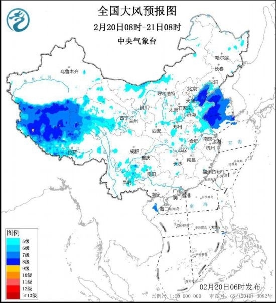 中央氣象臺(tái)2月20日6時(shí)繼續(xù)發(fā)布大風(fēng)藍(lán)色預(yù)警: