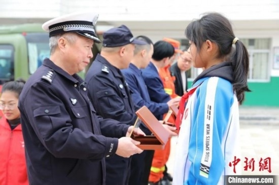 消防員、交警和電力工作人員聯(lián)合為學(xué)生代表頒發(fā)“安全小衛(wèi)士”證書,定期對(duì)學(xué)生傳授相關(guān)安全知識(shí)。李玲 攝