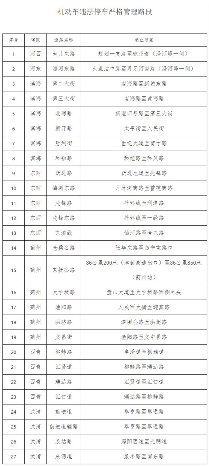 為進一步加強天津市道路交通安全管理,規(guī)范靜態(tài)交通秩序,提高道路通行能力,根據(jù)《中華人民共和國道路交通安全法》及其實施條例等有關法律法規(guī)規(guī)定,天津市公安交通管理局根據(jù)道路通行實際情況,決定自2024年3月18日起,將下列27條路段設置為機動車違法停車嚴格管理路段。機動車在嚴格管理路段內(nèi)違法停放的,公安交管部門將在提醒糾正的同時依法予以處罰。