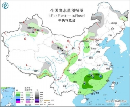 3月15日08時(shí)至16日08時(shí),新疆北部、青海北部、甘肅、內(nèi)蒙古東部、黑龍江北部、河北西北部等地部分地區(qū)有小到中雪或雨夾雪,其中,新疆沿天山地區(qū)、青海東北部、黑龍江東北部等地部分地區(qū)有大雪(5~8毫米)。甘肅南部、寧夏南部、陜西西南部、湖北南部、湖南、江西大部、重慶東部、貴州大部、華南大部等地部分地區(qū)有小到中雨,其中,湖南東北部、江西中部、廣西東北部等地部分地區(qū)有大雨(25~35毫米)。新疆北部、青海東部、甘肅、內(nèi)蒙古大部、黑龍江東部、吉林東部等地部分地區(qū)有4~6級(jí)風(fēng),其中,新疆伊犁河谷和沿天山地區(qū)等地有8~9級(jí)風(fēng),山口風(fēng)力可達(dá)10~11級(jí)。新疆東部和南部、內(nèi)蒙古西部、青海西北部、甘肅中西部、寧夏、陜西北部等地的部分地區(qū)有揚(yáng)沙或浮塵天氣,內(nèi)蒙古西部、甘肅中部局地有沙塵暴。