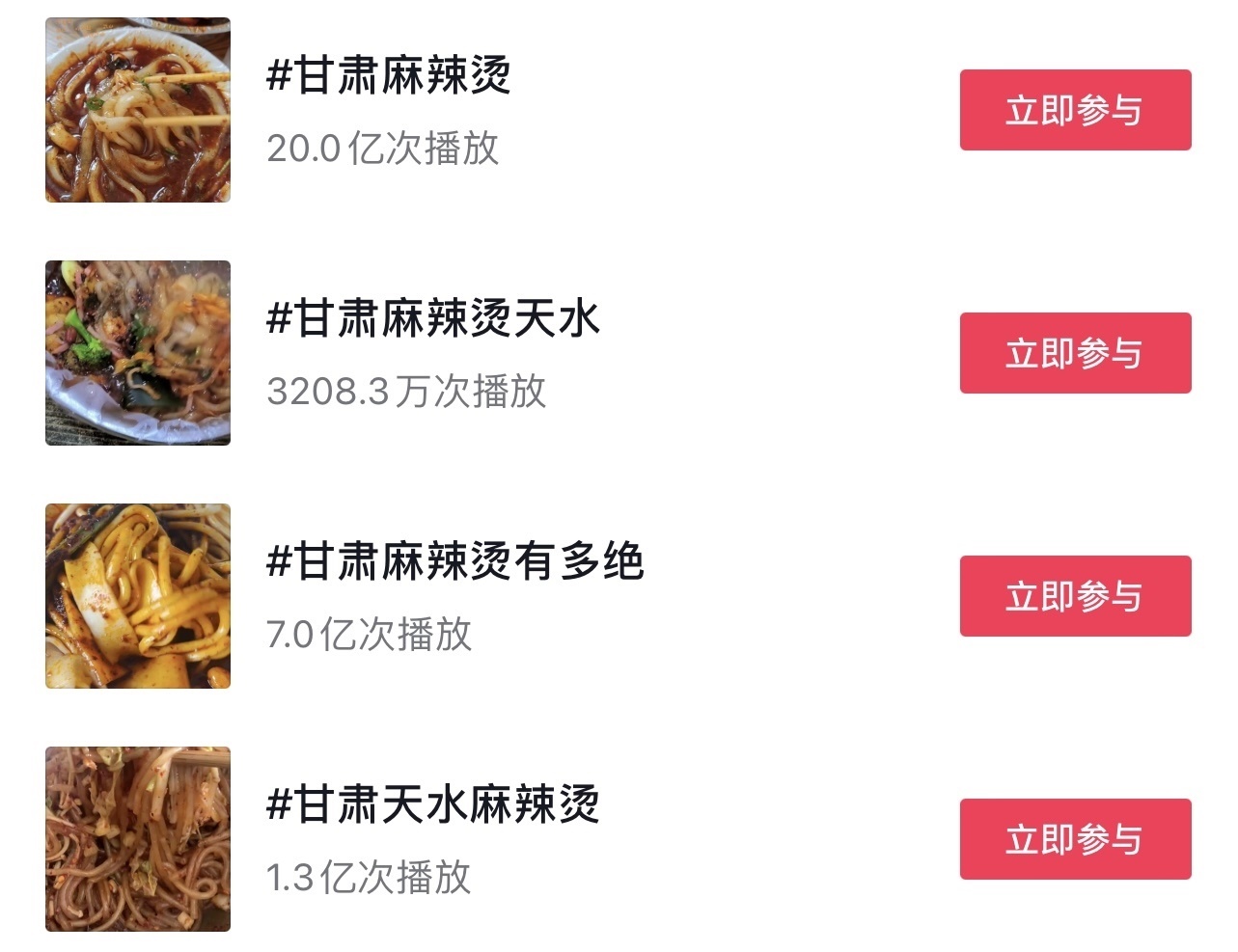 “這兩條視頻吸引了大量網(wǎng)民觀看、點贊、轉發(fā),之后陸續(xù)有網(wǎng)民發(fā)布相關視頻?!?月18日,甘肅省文化和旅游廳在回復網(wǎng)友建議中提到,3月份以來,“甘肅麻辣燙”話題迅速發(fā)酵,視頻內(nèi)容迅速增加,多次登上抖音、快手等短視頻平臺熱榜。截至3月16日18:00,各大短視頻平臺上“甘肅麻辣燙”相關話題累計播放量已超過32.6億次。