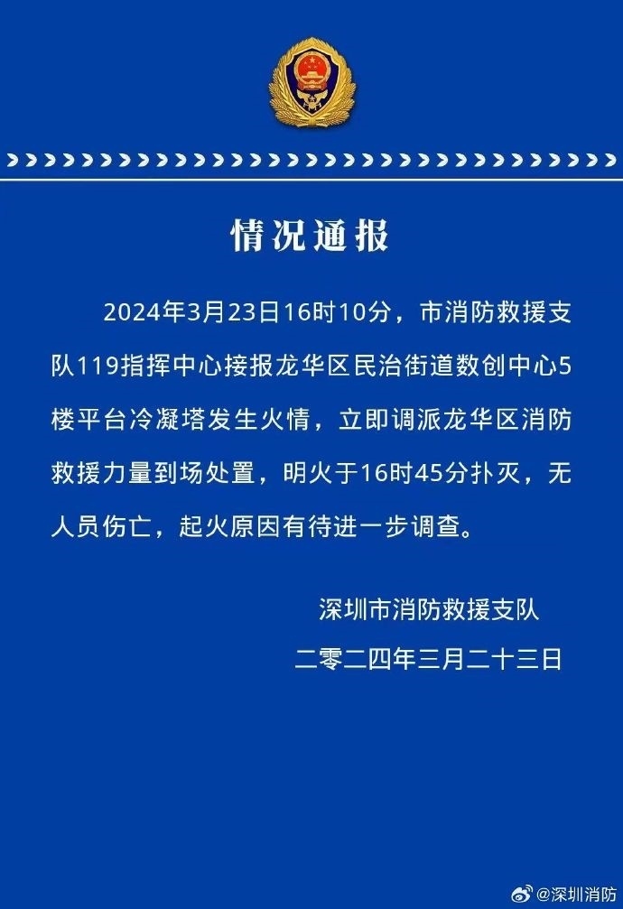 央視網(wǎng)消息:深圳市消防救援支隊(duì)發(fā)布情況通報(bào),2024年3月23日16時(shí)10分,市消防救援支隊(duì)119指揮中心接報(bào)龍華區(qū)民治街道數(shù)創(chuàng)中心5樓平臺(tái)冷凝塔發(fā)生火情,立即調(diào)派龍華區(qū)消防救援力量到場(chǎng)處置,明火于16時(shí)45分撲滅,無(wú)人員傷亡,起火原因有待進(jìn)一步調(diào)查。