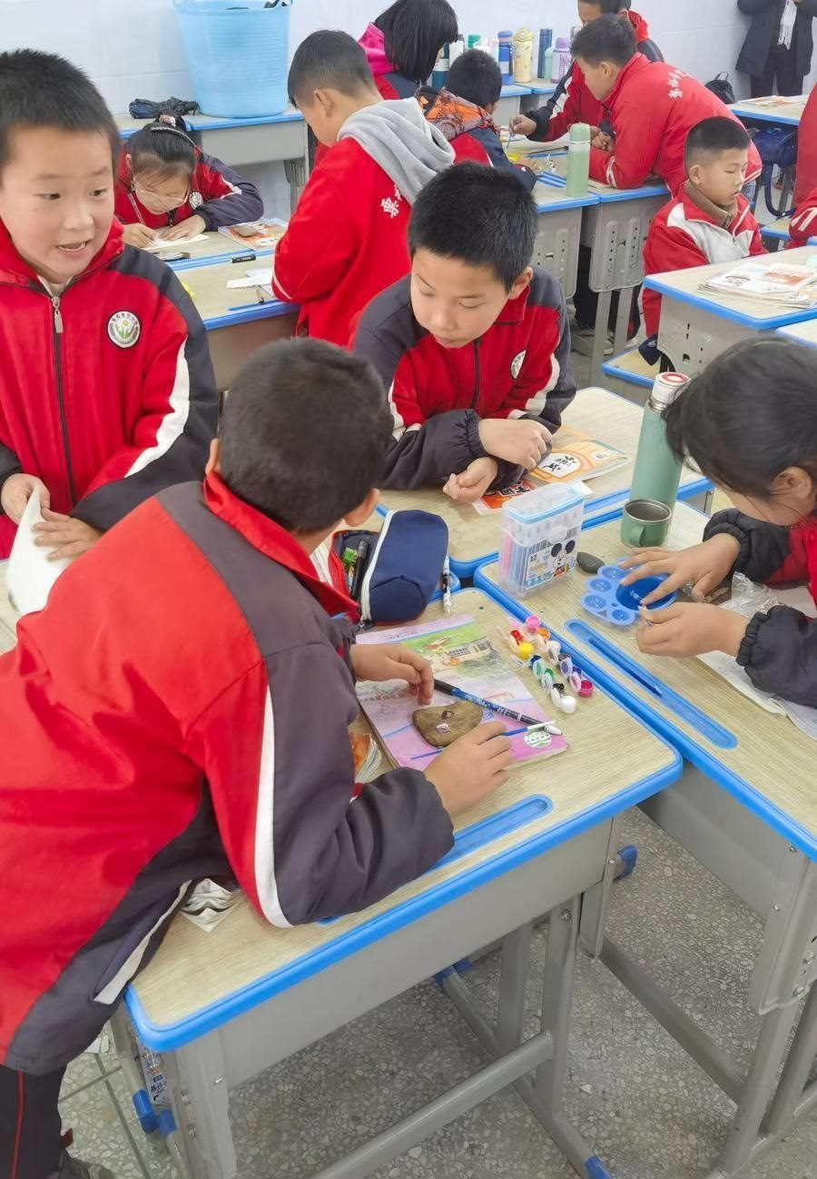 美術(shù)課上,李柏霖讓孩子們?cè)谑^上作畫(huà)