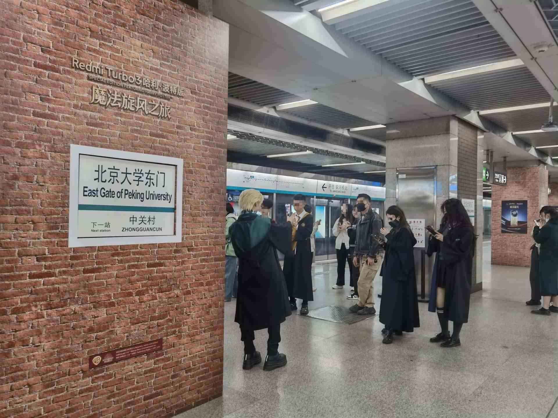 北京大學(xué)東門地鐵站內(nèi),眾多市民打卡拍照哈利·波特站臺