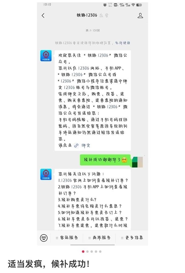 “你不理我是因?yàn)樵诮o我候補(bǔ)嗎”“親愛的我要票”……另一名網(wǎng)友也發(fā)帖稱,自己使用向12306微信公眾號“發(fā)瘋”的辦法,成功候補(bǔ)到了車票,其發(fā)布的網(wǎng)帖題為“適當(dāng)發(fā)瘋候補(bǔ)成功”。