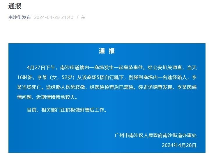 官方通報(bào)廣州一女子商場(chǎng)跳樓砸中人