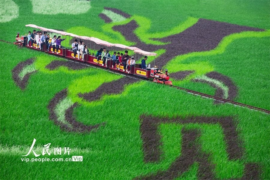2024年5月2日,廣西南寧市賓陽(yáng)縣古辣鎮(zhèn)大陸村綠油油的田野上,“見龍?jiān)谔?國(guó)安家圓”大型中國(guó)龍主題稻田藝術(shù)畫吸引了許多游客前來(lái)參觀游覽。曾祥忠攝(人民圖片網(wǎng))