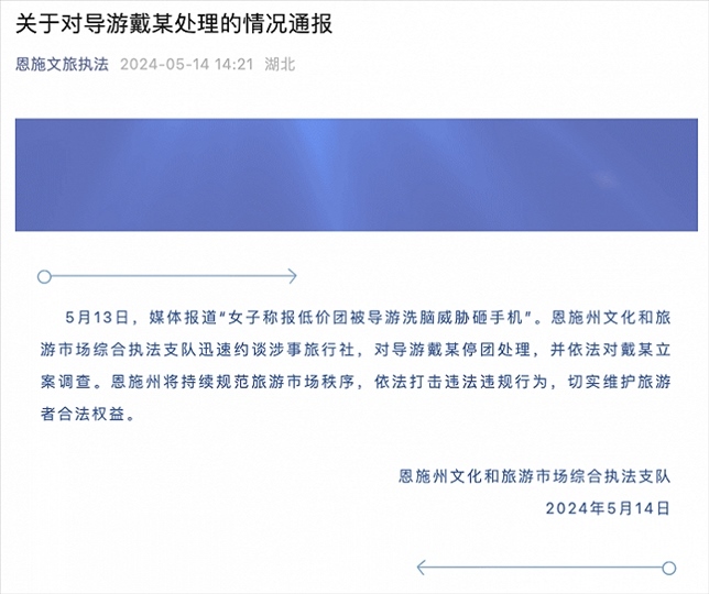 央視網(wǎng)消息:湖北恩施州文化和旅游市場(chǎng)綜合執(zhí)法支隊(duì)5月14日通報(bào),5月13日,媒體報(bào)道“女子稱(chēng)報(bào)低價(jià)團(tuán)被導(dǎo)游洗腦威脅砸手機(jī)”。恩施州文化和旅游市場(chǎng)綜合執(zhí)法支隊(duì)迅速約談涉事旅行社,對(duì)導(dǎo)游戴某停團(tuán)處理,并依法對(duì)戴某立案調(diào)查。恩施州將持續(xù)規(guī)范旅游市場(chǎng)秩序,依法打擊違法違規(guī)行為,切實(shí)維護(hù)旅游者合法權(quán)益。