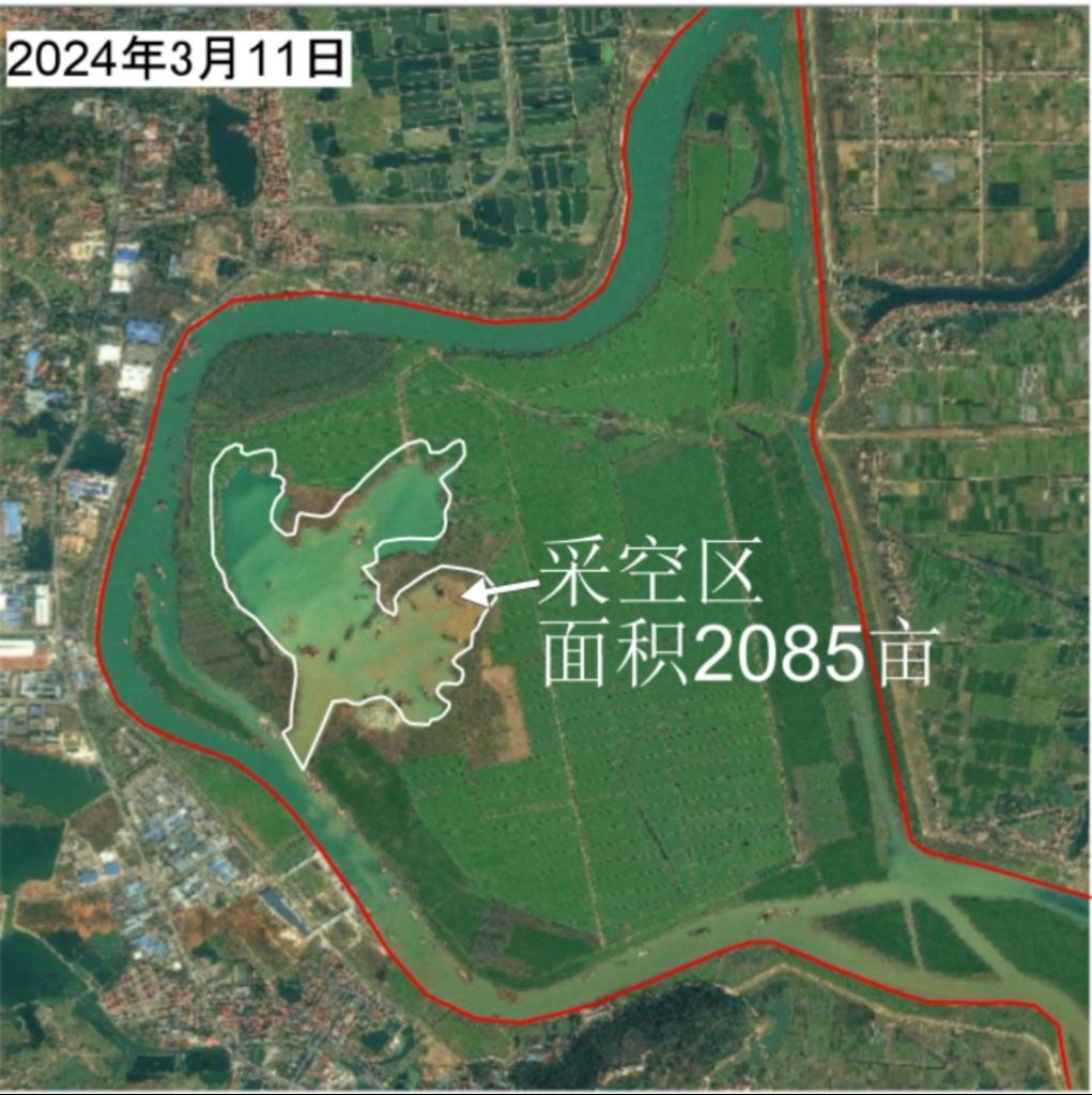 督察組查詢衛(wèi)星影像顯示,澧水河口濕地保護區(qū)孟姜垸洲灘被大面積采挖。(督察組供圖)