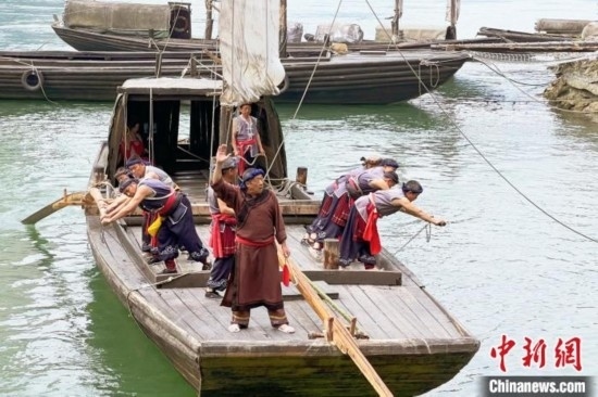 “天天拉船三峽邊吶,哎喲……”18日清晨,湖北省宜昌市三峽人家風(fēng)景區(qū),隨著船夫們有節(jié)奏地?fù)u槳升帆,峽江號子回響在長江三峽西陵峽山水間。