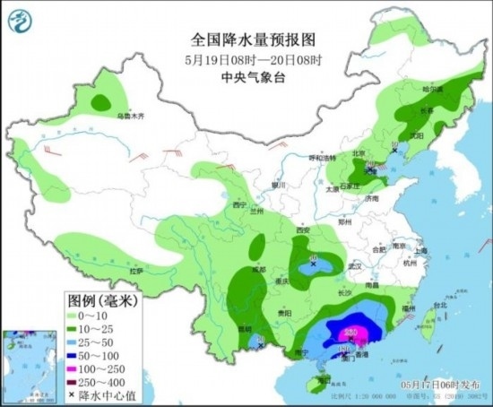 圖3 全國降水量預(yù)報(bào)圖(5月19日08時(shí)-20日08時(shí))