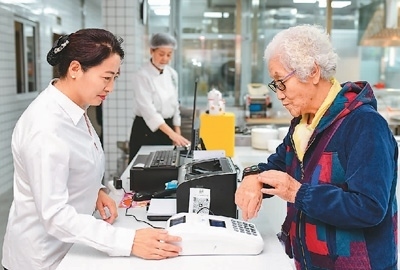 一位老人在內(nèi)蒙古自治區(qū)鄂爾多斯市康巴什區(qū)神華康城社區(qū)“鄰里食堂”使用智能積分刷卡器用餐。王 正攝(人民視覺(jué))
