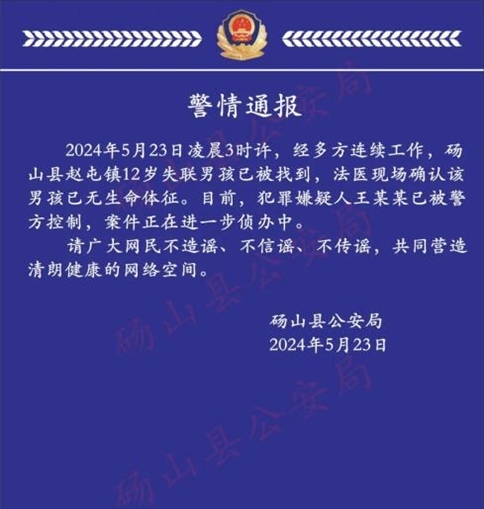 ·安徽碭山12歲男孩失聯(lián)3天后遺體被找到,警方通報:嫌犯被控制。