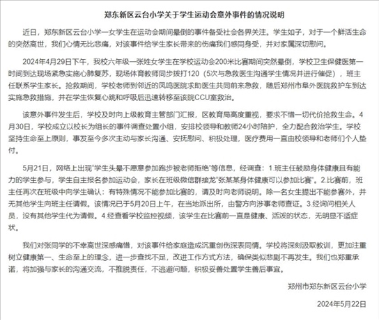 ·鄭州一小學生短跑暈倒后離世,學校通報系自主報名賽前無不適。