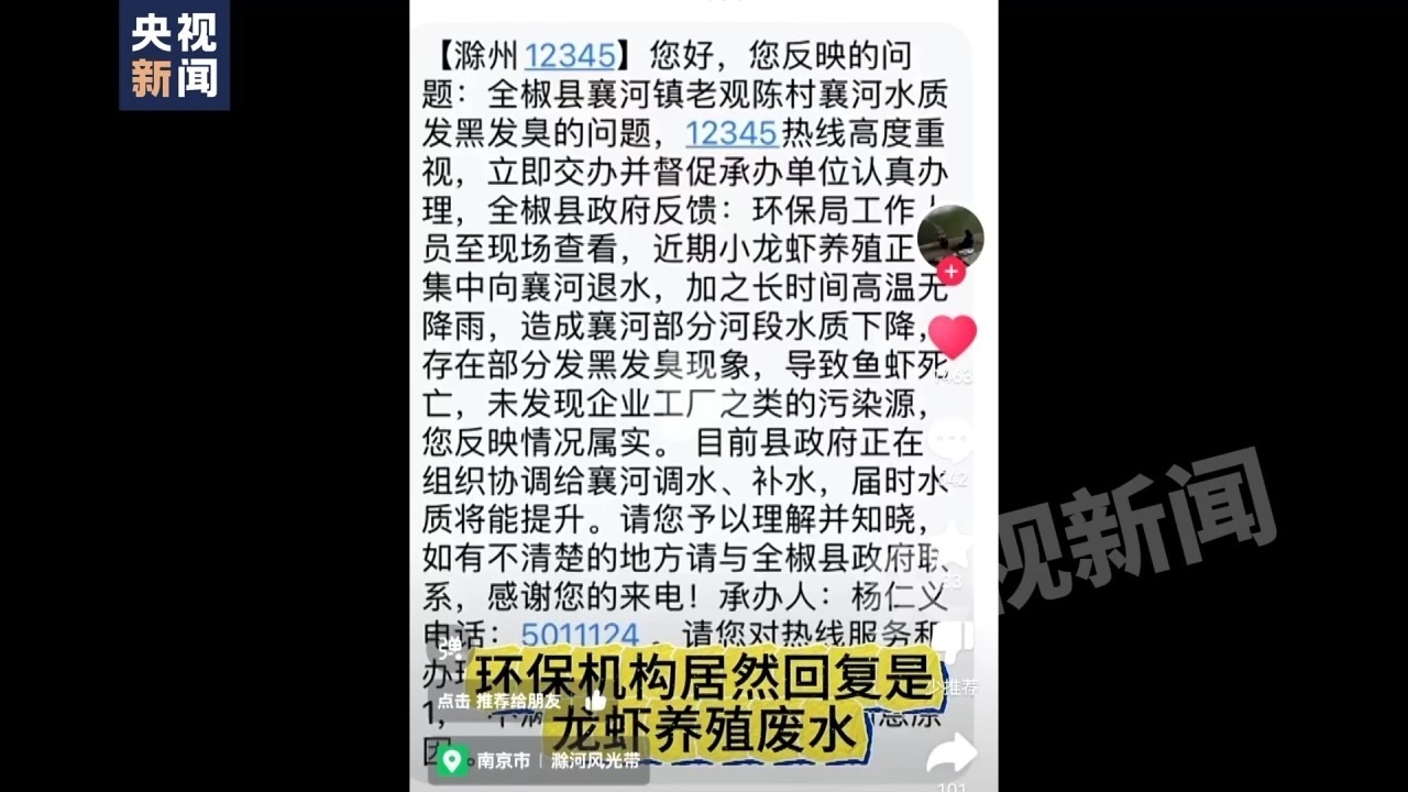 記者:但是我看到了有一個(gè)滁州12345,關(guān)于全椒縣襄河鎮(zhèn)老觀陳村襄河水質(zhì)發(fā)黑發(fā)臭問(wèn)題的回復(fù),留的承辦人叫楊仁義。