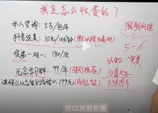 此外,不少婚戀軍師都公開了聯(lián)系方式,通過(guò)提供一對(duì)一指導(dǎo)、付費(fèi)視頻、情感課程、收徒、經(jīng)營(yíng)朋友圈教學(xué)等形式斂金,且價(jià)格不菲。