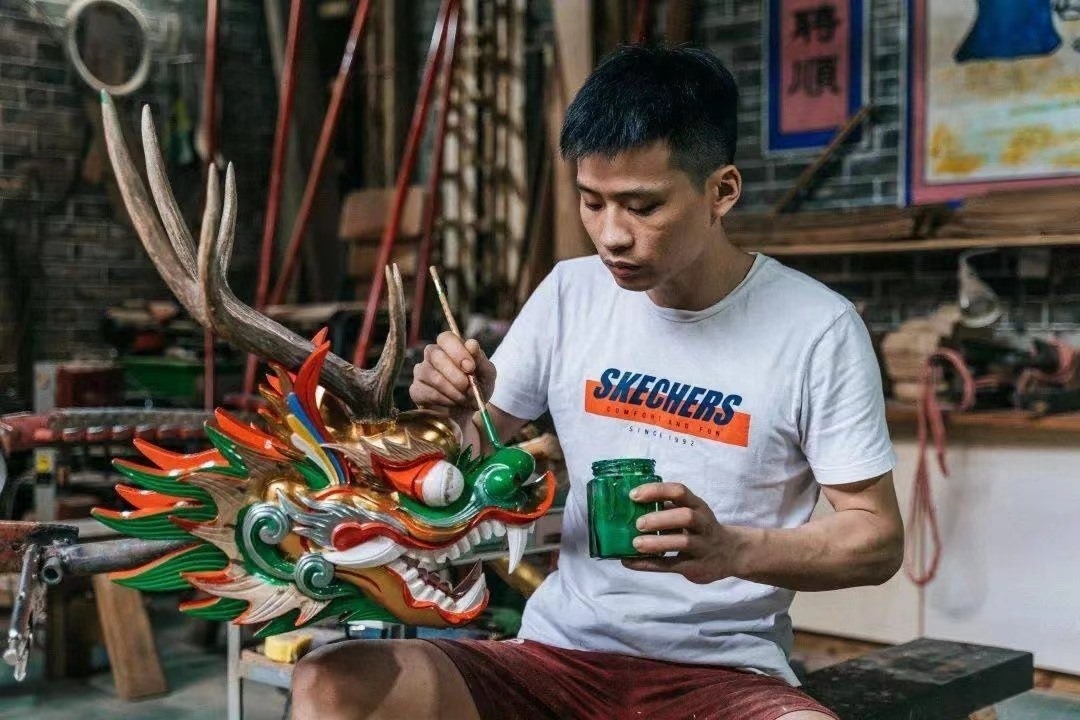 十五年間,張偉潮已記不清他雕刻或翻新了多少龍頭,同樣的刀銼雕鏤,卻是各不相同的勇猛威嚴,慈眉善目。形態(tài)各異的龍頭之上,承載的是一個村落的鄉(xiāng)愁,一支隊伍的雄心,一方百姓的豪情。最初一家三口扛起的小作坊,也迎來了越來越多的年輕學徒。