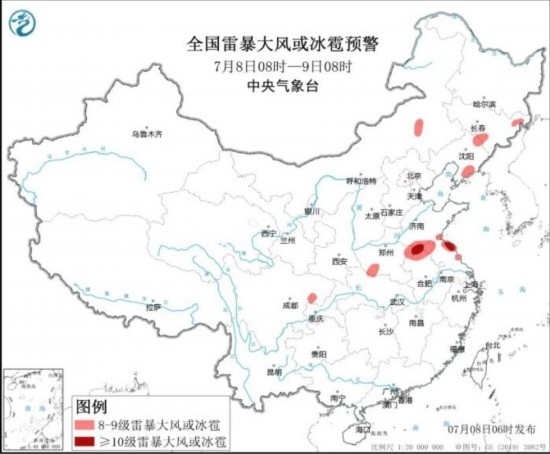 全國雷暴大風(fēng)或冰雹預(yù)警(7月8日08時(shí)-9日08時(shí))