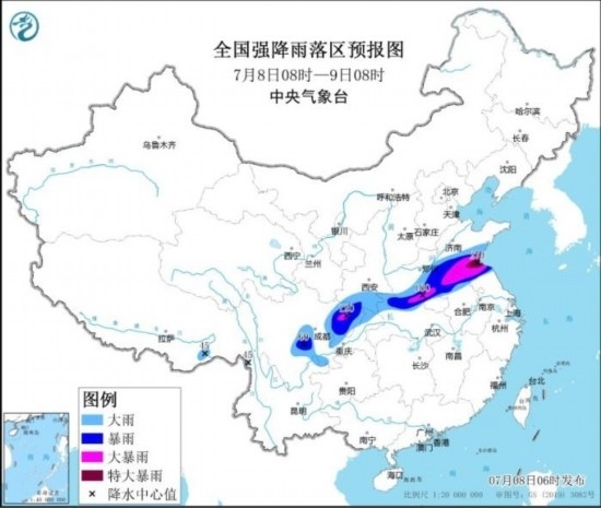 全國強(qiáng)降水落區(qū)預(yù)報(bào)(7月8日08時(shí)-9日08時(shí))