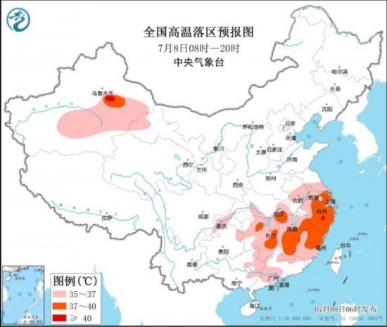 全國高溫落區(qū)預(yù)報(bào)圖(7月8日08時(shí)-20時(shí))