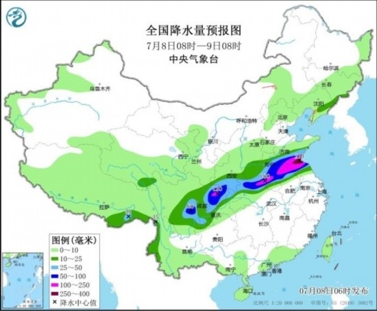 全國降水量預(yù)報(bào)圖(7月8日08時(shí)-9日08時(shí))