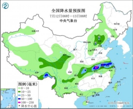 全國降水量預(yù)報(bào)圖(7月12日08時(shí)-13日08時(shí))