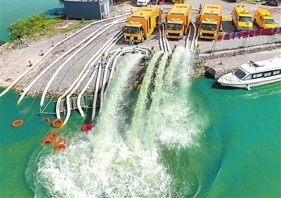 在浙江省臺州市防汛防臺綜合應急演練中,市政強排車進行作業(yè)。孫金標攝(人民圖片)