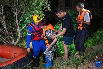 凌晨2時(shí)許,記者在決口現(xiàn)場(chǎng)看到,由于道路狹窄,通行不便,消防隊(duì)員扛著救生艇向受災(zāi)區(qū)域挺進(jìn),不斷有受災(zāi)群眾乘坐救生艇被轉(zhuǎn)移至安全地帶。
