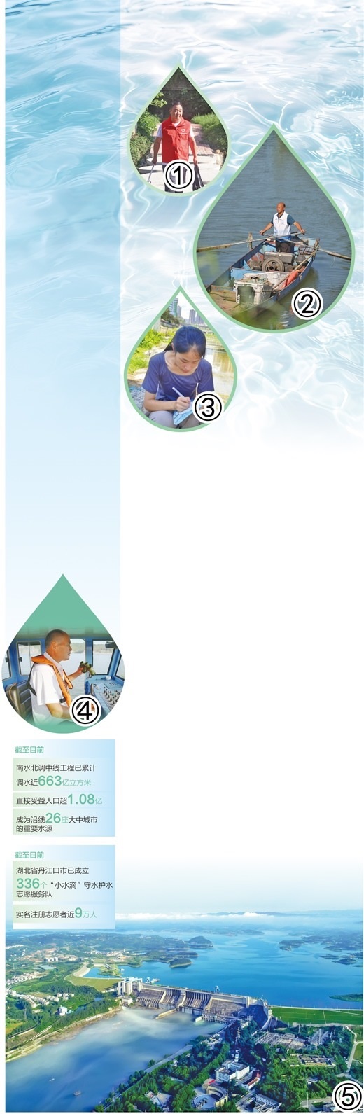 圖①:涂青海在巡線(xiàn)時(shí)撿拾垃圾。段 浩攝 圖②:蔣德新在巡護(hù)。丹江口市委宣傳部供圖 圖③:廖思盈在記錄水質(zhì)采樣數(shù)據(jù)。漢江師范學(xué)院供圖 圖④:肖安山在駕駛清漂船。鄖陽(yáng)區(qū)委宣傳部供圖 圖⑤:丹江口水庫(kù)鳥(niǎo)瞰。丹江口市委宣傳部供圖 數(shù)據(jù)來(lái)源:中國(guó)南水北調(diào)集團(tuán)有限公司、丹江口市委宣傳部