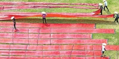 3月26日,廣東省佛山市順德區(qū)一香云紗產研文化基地的工人,利用晴好天氣抓緊時間曬香云紗。王國榮攝(人民圖片)